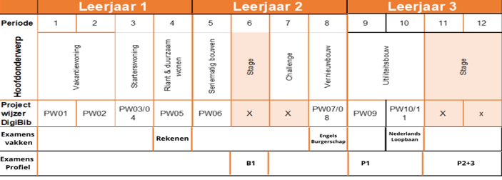 Hieronder zie je globaal waar je aan werkt per periode. In het tweede jaar van je opleiding kies je een specialisatie. Je kunt dan kiezen voor “Ontwerp”, “Uitvoering” en “Ontwikkeling in vastgoed”.